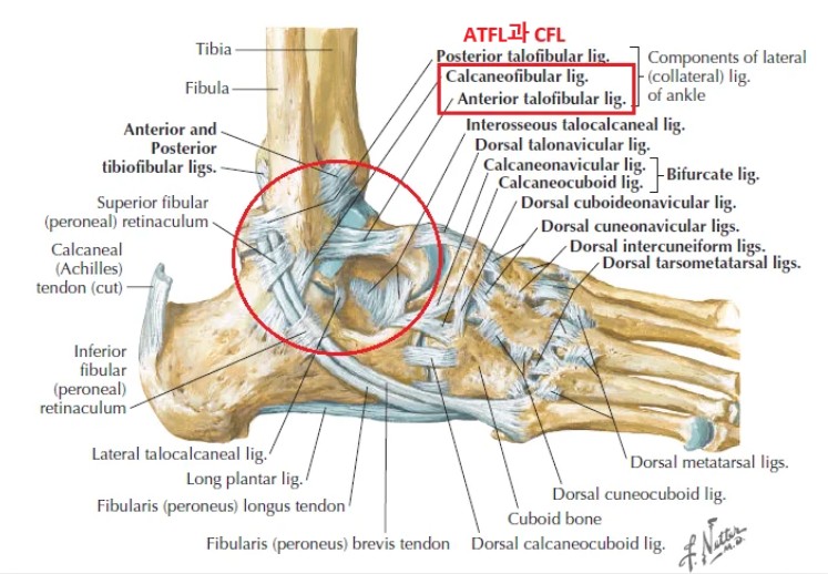 • 외측 인대군: ATFL(전거비인대) → CFL(종비인대) 순으로 잘 다칩니다. 가장 흔한 기전은 내번(inversion) + 약간의 족저굴곡입니다.