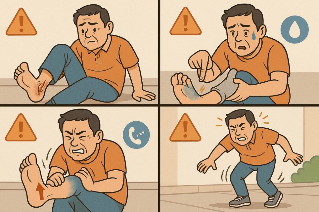 • 발/발가락 감각 이상·차가움·창백·맥박 약화(혈관·신경 손상)