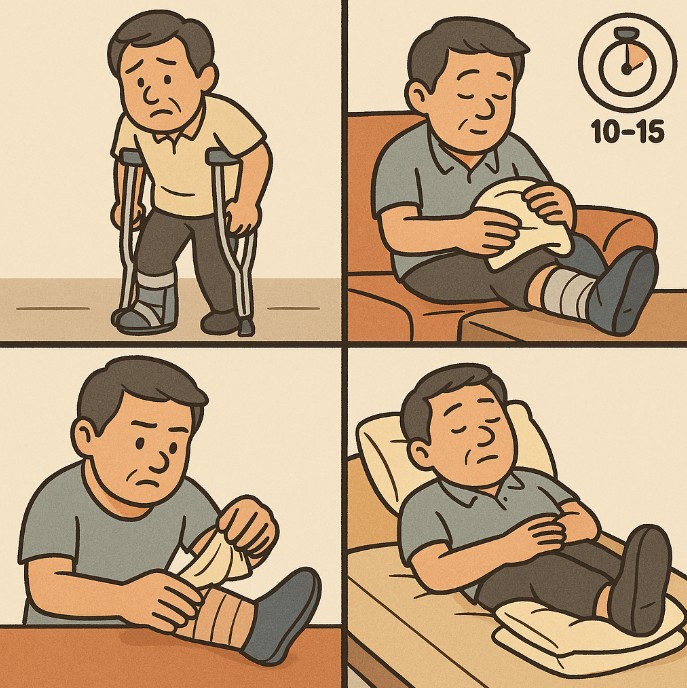 • Ice: 10–15분, 하루 여러 차례 쿨링(피부손상 방지 위해 천/팩로 감싸서).