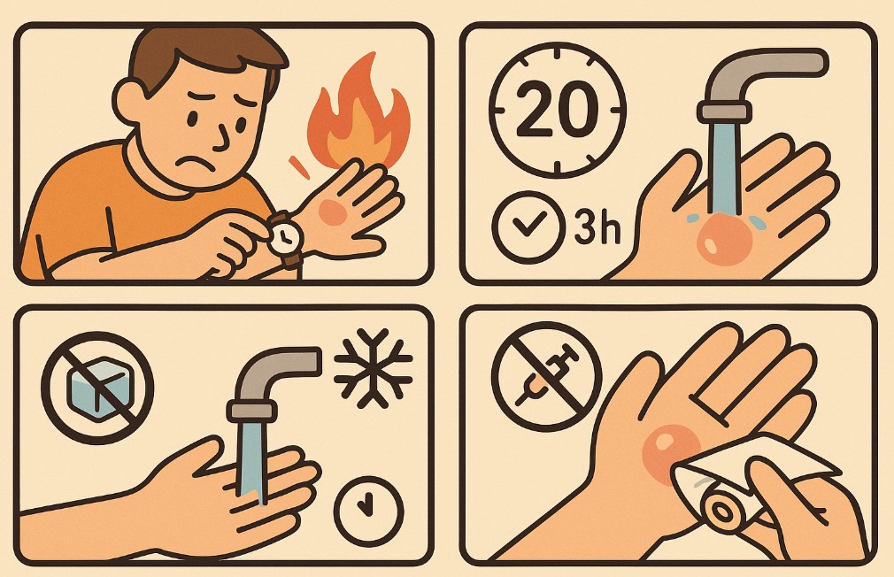 • 하지 말기: 얼음·치약·된장·연고 남발, 수포 터뜨리기, 의복이 붙었으면 억지로 떼기.