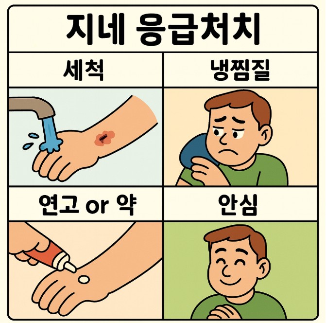 흐르는 물로 세척 → 냉찜질 10–20분 간헐 반복 → 진통제(±항히스타민).