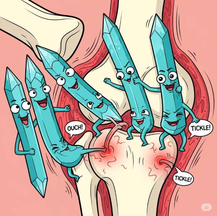 피 속 요산이 많아져 관절액에 녹아 있다가 바늘 모양 요산결정으로 뭉치며 생기는 급성 염증이에요.