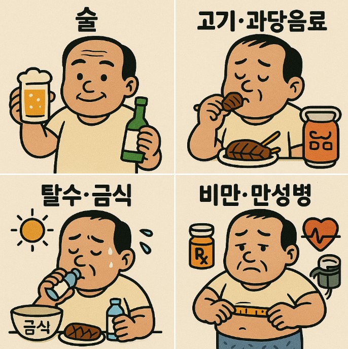 • 음식: 내장류·붉은 고기·일부 해산물(멸치·정어리·새우 등) 고퓨린 식단과당 음료.