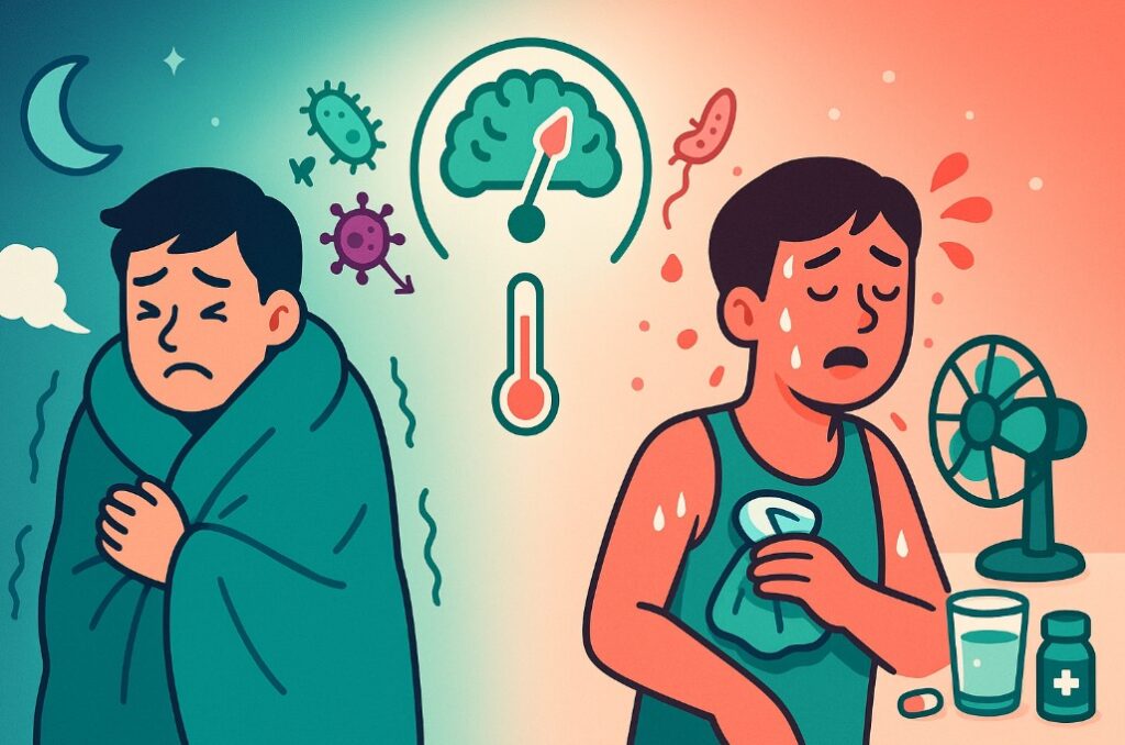 감염·염증 신호(IL-1, IL-6, TNF 등)가 시상하부의 설정온도를 올리게 하고, PGE2 경로가 관여합니다. 그러면 몸은 그 새 목표에 맞추려고 오한·소름-말초혈관수축(열을 올리는 행동) → 이후 목표에 도달하면 땀·혈관확장(열을 식히는 행동)을 보입니다. 그래서 열 오를 땐 오히려 춥고, 손발은 차갑다고 하면서 불안해 하시는 분들이 많습니다.