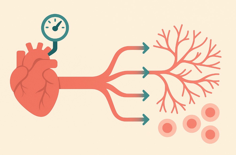 심장은 피를 밀어 보내는 펌프이고, 목표는 모세혈관까지 산소·영양을 전달하는 것. 굵은 관(큰 동맥)까진 쉽지만, 아주 촘촘하고 가는 관(모세혈관) 끝까지 보내려면 밀어붙이는 압력이 필요합니다. 이 밀어붙이는 힘이 바로 혈압입니다.