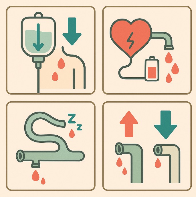 | 펌프 기능(Heart) | – | 급성 심근경색, 심부전, 심한 서맥·빈맥 부정맥 | 펌프 약해지면 혈압↓ |