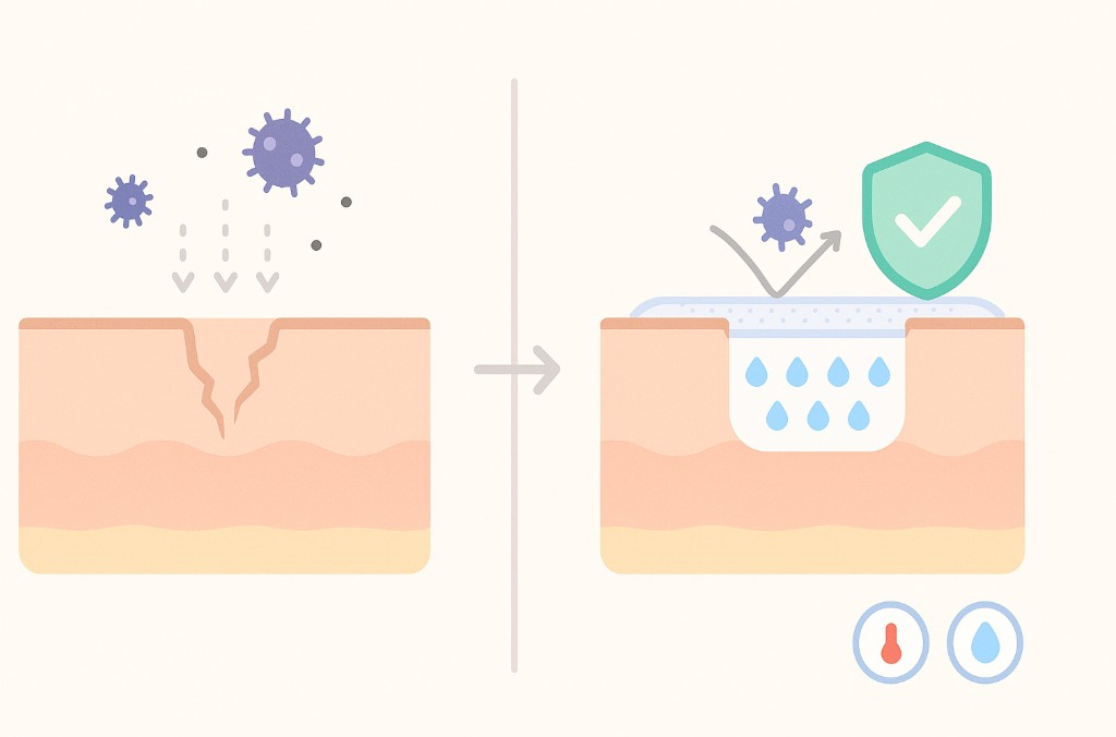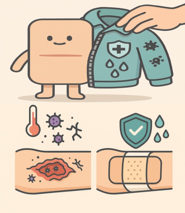 정상 피부는 외부 환경에 노출되어도 침투를 막는 방어막을 갖지만, 상처는 이 방어력이 깨진 상태라 건조·오염·재손상에 취약합니다. 드레싱은 말 그대로 상처에 옷을 입히듯 덮어 주어 적정한 습도와 온도를 유지하고, 외부 충격과 균 오염을 줄이며, 분비물을 흡수하고, 필요하면 조직 제거나 약물 전달을 돕는 과정입니다.
